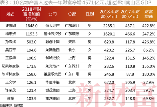 在资本市场上被极度压制后的反弹,叠加过去一两年“涨价去库存”的战果,让地产行业富人成为今年榜单上最大赢家。据新财富统计,房地产行业前十名增速最快的富人,去年一年身家合计上涨了4571亿元,比深圳南山区2017年GDP(4500亿元)都要高,后者为腾讯、大疆等码农工厂聚集地,常住人口超过130万。