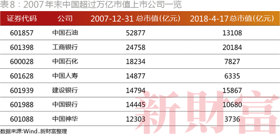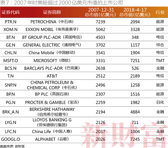 中国TMT企业的追赶速度更加惊人,2007年时,腾讯连苹果市值的1/10都不到,而今差距缩小到一半。从中国自身最大市值公司来看,这种跨行业跨时间的对比也十分瞩目。从历史变迁看,2007年时中国市场上的市值王是5万亿的中国石油和2万多亿的工商银行如今中国石油市值1.4万亿元,工行市值还是2万多亿元。十年前市值超过万亿的公司清一色为国资,或能源或金融,与美股十年前超过2000亿美元市值的公司结构一致。而当时的腾讯、阿里市值只有千亿港元(150亿美元内),10年间增长到了4000多亿美元(表8)。