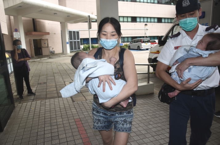 昨日上午11時許,警方接獲一名姓沈婦人(50歲)報案,指一對孫兒被獨留家中,警員接報到上址調查,發現一對6個月大男嬰,並無成人在家,沈婦表示其新抱曾致電她,說要返回深圳尋找丈夫,之後再找不到媳婦,擔心下趕到其家查看,發現竟留下孖仔無人照顧,盛怒下才報警求助。救護員即場替一對小兄弟檢查,並無受傷,遂將2人送院作詳細檢查,女警協助送往北區醫院,至下午約4時,兄弟倆由祖母陪同轉送大埔那打素醫院。