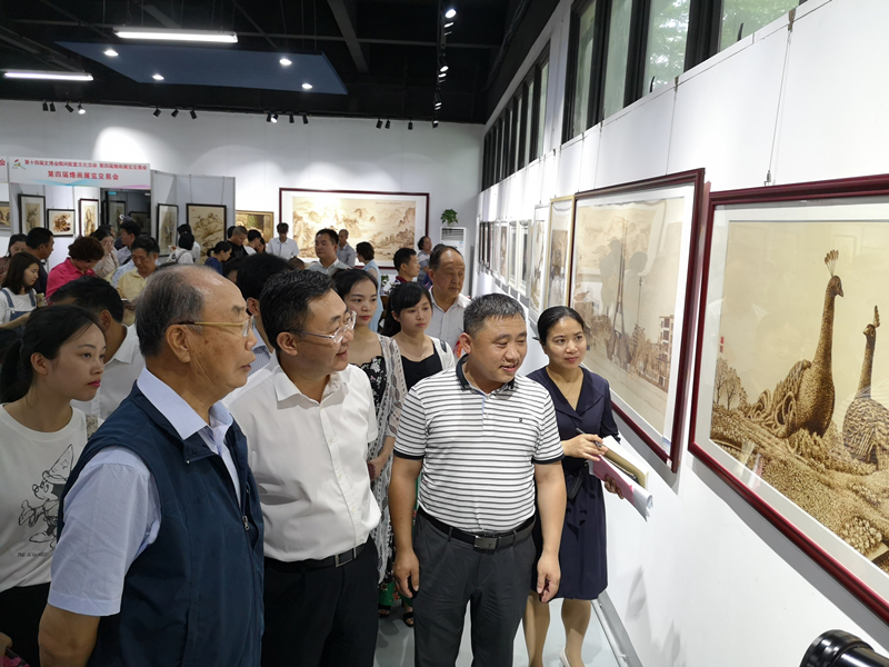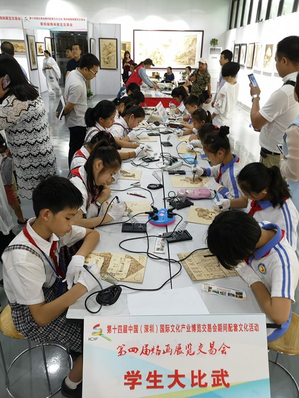 开幕式结束后,参会领导嘉宾参观了光明烙画基地组织的学生技艺大比武,并欣赏了本届参展的烙画作品。