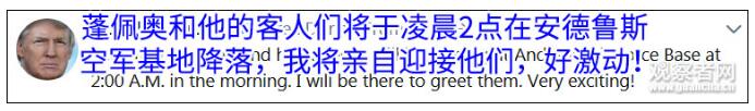 特朗普随后又发推说,他将在凌晨2点亲自于马里兰州的安德鲁斯空军基地迎接这几名“客人”。