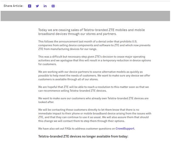 澳大利亚电信telstra称,继美国下达禁令阻止中兴通讯为澳大利亚电信生产产品后,公司将在商店和合作方停售贴本公司品牌的中兴手机和移动宽带设备。Telstra还表示,如果中兴能够顺利解决这次事件,他们将重新开始销售贴本公司品牌的中兴的设备。