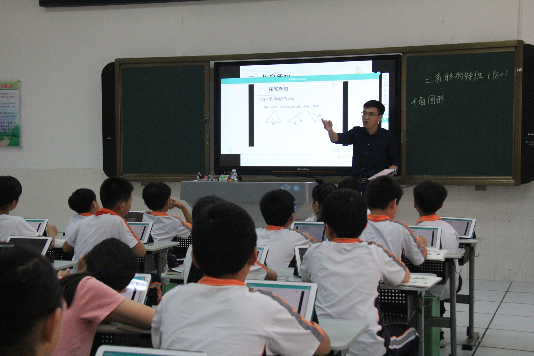 在中心小學觀摩了一體機的應用課堂後,記者還走進了該校慕課試點實驗班。當時,該班正在上“三角形的應用”數學課。學生在老師的帶領下學習三角形畫高,記者看到學生個個在自己手上的平板電腦上進行現場操作,學生的操作結果在一體機上得到實時分析反饋,老師根據學生的掌握情況現場作出了點評與解答。