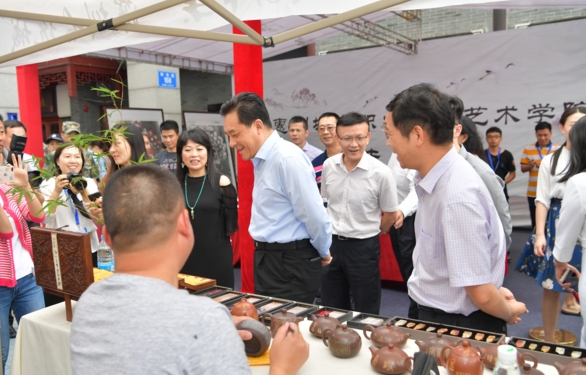 开幕式结束后,大家一起参观了"传承·文创——世界非遗龙泉青瓷国礼瓷展“,其中展示了G20峰会、世界互联网大会专用瓷、工艺大师精品大作,还有“陶中瑰宝——惠风古陶博物馆元代黑陶车马俑展”、“大宋之雅——景德镇湖田窑精品标本、完整器展”、“中国白玉精品暨玉雕大师作品展”、“华夏遗珍博物馆明清玉器展”、“惠州城市职业学院艺术学院文创特展”等精彩展览,嘉宾们对展品品质赞不绝口。贺海涛书记经过深圳古玩城分会场的文创市集时停下脚步,对文创市集摊位上的小物件表现出浓厚的兴趣,他提到希望古玩文化创意产业可以更加注重版权,增加科技含量,不断提高市场占有率和出口比重,为罗湖区文化产业发展做出更大贡献。