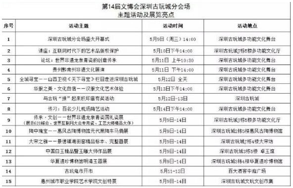 据悉,在第12届、13届文博会上,贵州黔南非遗村的少数民族为深圳市民带来了国家级非遗黔南贵定长衫龙、国家级非遗黔南惠水好花红调、黔南州少数民族服装展演、国际合唱金奖黔南绕家大歌等精彩表演,本届文博会上他们将再次为观众奉上了民族特色的歌舞表演。值得一提的是,11日,古玩城正式开启深圳市首个淘宝鬼市,广招广东省及周边省份一线铲地皮老货商家,汇聚深圳古玩城百大酒窖中庭广场为您呈现一线老货,请自备手电筒,淘得开心,淘得尽兴。12日,“全城寻宝——山西卫视《天下寻宝》栏目”将走进深圳古玩城,届时现场将有四位专家为广大藏友鉴宝,专家团队包括:片儿白古瓷标本博物馆馆长、著名古陶瓷鉴定专家白明;当代中国山水画家、著名书画家古籍鉴定专家金煜;国家文物出境鉴定天津站责任鉴定员、著名玉器鉴定专家施俊;从事杂项、钱币鉴定十余年、实力派鉴定专家王荣琳。13日,汉服文化体验活动将有汉服秀、汉服小视频征集、汉服文化体验等,让市民们着汉服、习礼仪。14日,百名少儿现场陶艺活动,将迎来百名小学生现场制陶活动,作为深圳古玩城分会场的传习交流活动,让广大游客及青少年朋友在娱乐中领略中华文化的博大精深,铭记历史,传承中华民族的传统美德,使中华优秀传统文化得到进一步弘扬。