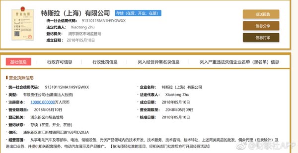 【香港商報網訊】根據國家企業信用信息公示系統顯示,特斯拉(上海)有限公司獲上海浦東新區市場監管局核發的營業執照,註冊資本1億元人民幣,股東為特斯拉汽車香港有限公司,公司成立日期為5月10日。
