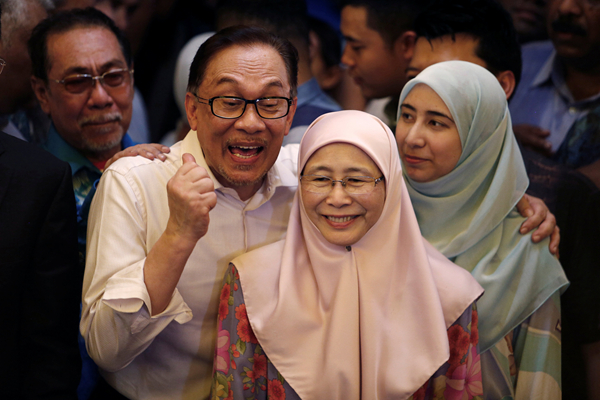 安華獲釋後與妻子及女兒一起出席支持者舉行的慶祝大會。 路透社