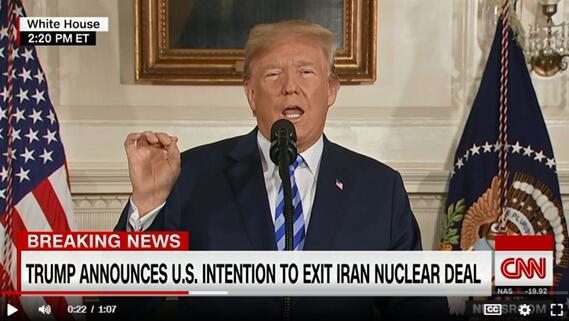 5月8日,特朗普在白宫讲话,宣布退出伊核协议。(CNN视频截图)