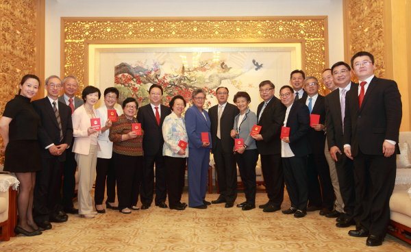 5月20日上午,全国政协副主席董建华、梁振英,副秘书长潘立刚向刘汉铨等近60位荣休港区十二届全国政协常委和委员颁发荣誉证牌。(图片来源:中央政府驻港联络办)