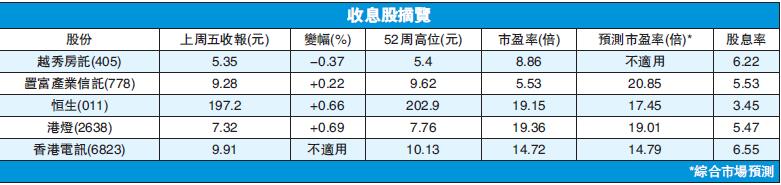 另一隻REITs——置富產業信託,其息率也高達5.53%。置富去年底以20億元出售北角和富薈,其中11億元用作償還銀行貸款,餘下9億元將可作再投資,未來集團或會物色收購對象。而今年開始置富將分階段對置富嘉湖進行翻新,料完成後可吸引更多人流,提升出租能力及租金水平。置富旗下為私人屋苑零售物業組合,主要與民生有關,因此抗跌力較強,且本港零售市道好轉,去年底集團的物業出租率升至98.1%,而續租率維持在78%水平,錄得續租租金調升率12.8%。