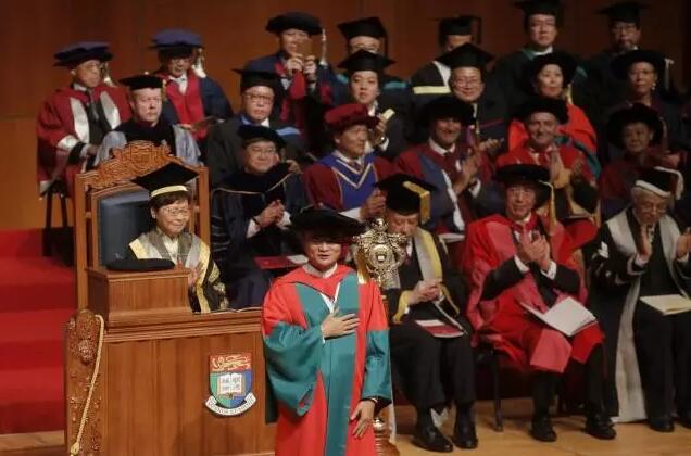 18日,在港大李兆基会议中心大会堂举行的第199届学位颁授典礼上,阿里巴巴集团主席马云身穿红绿礼袍,从香港特首、港大校监林郑月娥手中接过黑色天鹅绒圆边礼帽——这已是马云获得的第5个博士学位。