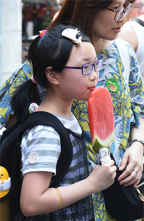 炎热天气下有女童吃大片西瓜消暑。