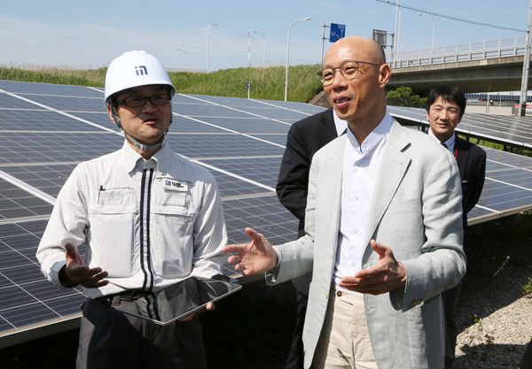 環境局局長黃錦星(右)考察沿東京成田機場快線Sky Access鐵路鋪設的太陽能光伏板設施。