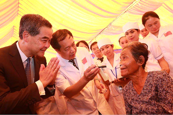 梁振英(左)喜見一名白內障女患者接受手術后回復光明。