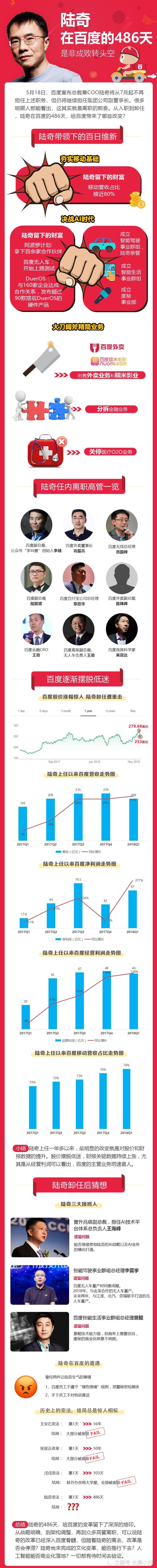 掐指一算,从入职到卸任,陆奇在百度工作的486天中对这家公司进行了大刀阔斧式的改革,这次百日维新给百度带来了怎样的影响?他的卸任又意味着什么?我们用一张图来告诉大家。