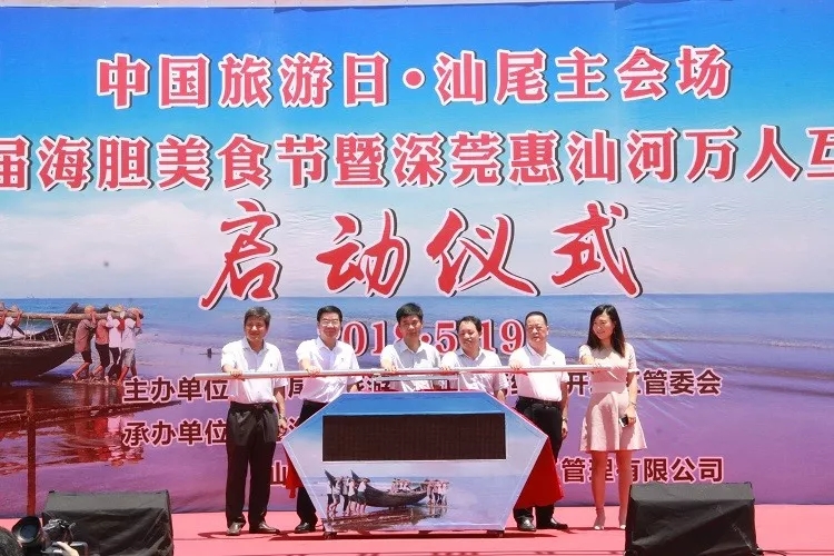 【香港商报网讯】记者余丽龄报道:为进一步扩大“美丽红海湾”品牌影响力,拓展客源市场,助推创建广东省全域旅游示范区,打造国际旅游休闲基地,5月19日上午,汕尾市旅游局和红海湾区管委会联合举办“中国旅游日汕尾主题活动——红海湾第二届海胆美食节暨深莞惠汕河万人互游系列活动启动仪式”。汕尾市政协副主席、旅游局长吕珠龙,区党工委书记、管委会主任吴城鑫、广东省旅游协会副秘书长周志红等出席活动。来自深圳、东莞、惠州、河源4地旅行团以及各景点负责人等700多人参加启动仪式。