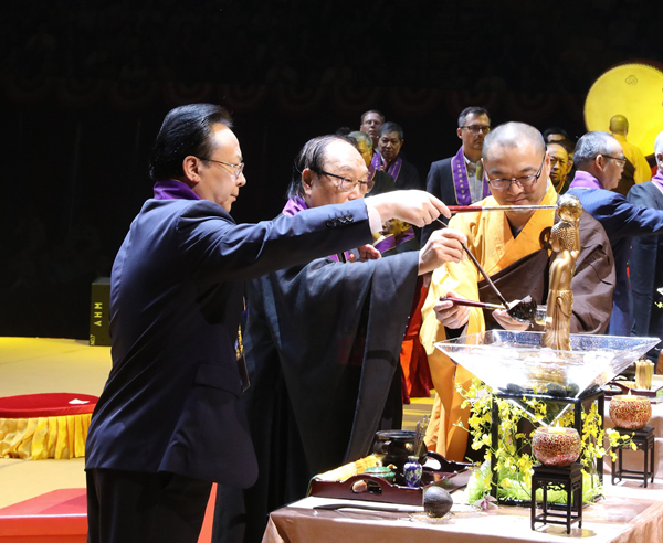 由香港佛教聯合會(佛聯會)主辦的慶祝佛历二五六二(2018)年佛誕節吉祥大會,昨日下午在紅磡香港體育館舉行浴佛大典。一眾主禮嘉賓鳴吉祥鐘,譚鐵牛及劉江華在一眾高僧引領下浴佛。可容納逾1萬觀眾的香港體育館座無虛席。活動完結后,不少市民在體育館外浴佛、抄經。