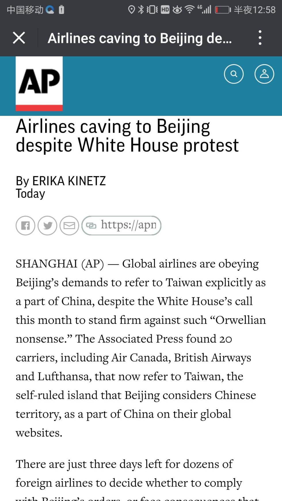 美联社称,距最后期限还有三天,多家外航屈从于北京,尽管白宫已抗议。