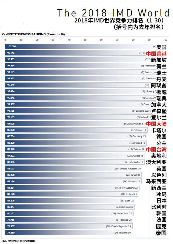 据报道,IMD依据340个统计资料、问卷调查题目,与全球55个调研或学术机构合作,完成《IMD世界竞争力排名》的国家和地区年度检视。此评比也被视为各经济体优、弱势能力的长期综合表现,2018年适逢此项全球调查的第30个年头。