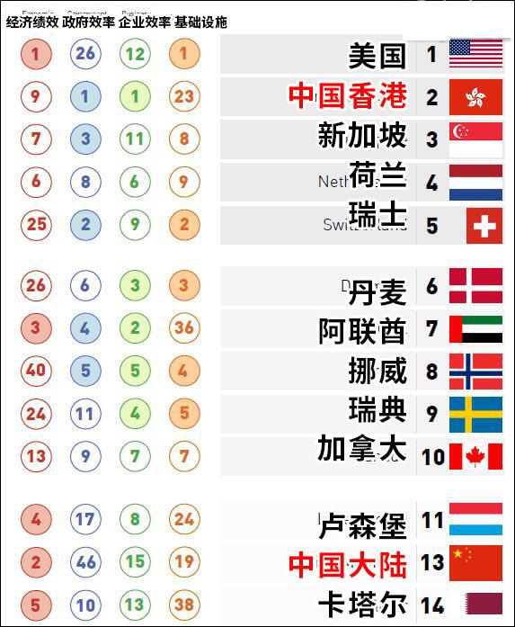 可以看到,中国大陆在“经济绩效”一项中排名最高,仅次美国达到第2;而在“政府效率”中则排名最低,仅为第46。中国香港的“政府效率”和“企业效率”更是双双登上榜首。