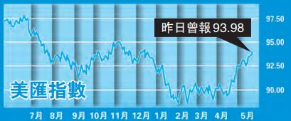 美匯指數於4月最低位88.94開始上升,在21日下午升破94元水平,創去年底以來的高點。美元的走強主要因素在於:首先,中國於3月份增持110億美元美國國債,總持有量達1.19萬億美元,這無疑是給美元注入一針強心劑,增加了國際社會對美元的信心。中東政局緊張,油價上升,刺激避險資金流入美元資產。同時間,美匯指數持續走強受到10年期國債孳息率升破3厘創7年新高影響。再者,隨加息步伐漸進,市場預計今年會有4次加息,並且預期通脹上升,觸發淡友補倉,使得美元變得炙手可熱。