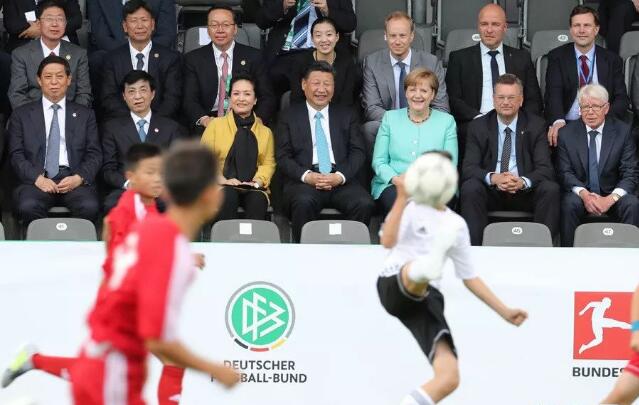 △2017年7月5日,国家主席习近平在柏林同德国总理默克尔共同观看中德青少年足球友谊赛。
