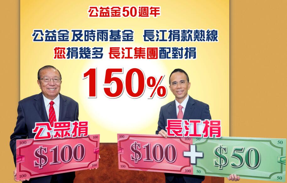在明日(周六)晚上8時半至11時半舉行的「萬眾同心公益金」電視籌款節目中,公眾可致電長江捐款熱線「18282」捐款「公益金及時雨基金」。屆時,長江集團將以「您捐幾多,長江集團配對捐150%」的贊助形式,配對公眾電話認捐的100%金額外,再額外多捐50%。