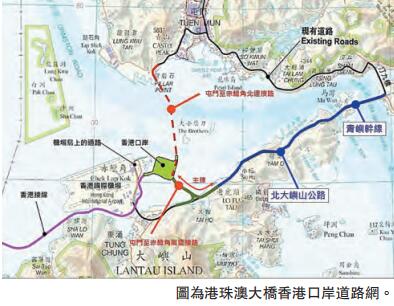 根據大橋香港口岸的道路網設計,車輛可行經屯門至赤鱲角連接路或機場島上的新建及現有道路(包括北大嶼山公路)前往香港口岸(見圖)。在大橋啟用初期,由於屯門至赤鱲角南面連接路尚未啟用,來往香港口岸及市區的跨境和本地交通必須取道機場島上的道路。現時,路政署正全力爭取盡早完成屯門至赤鱲角南面連接路的主線,即連接往市區方向的北大嶼公路的部分,預計主線可於今年內完成。屆時前往大橋香港口岸的車輛便無須取道機場島上的道路,交通更為便捷。