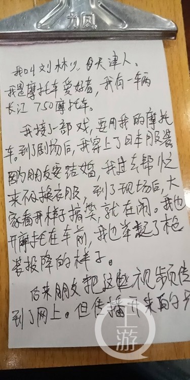 刘彬:事出有因。我是摩拖车发烧友,我有一辆长江750摩拖车。几天前,一个剧组想用我这辆摩拖车拍抗战网络剧,我不舍得让人家骑,我就说我也去拍戏。