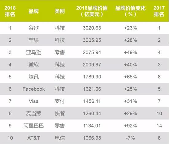 前10名中,科技或科技相关品牌占据八席。科技类品牌继续统治榜单,谷歌和苹果仍分别把持排行榜第一、二位:谷歌品牌价值增长23%,达到3021亿美元;苹果增长28%,达到3006亿美元。