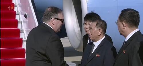 资料图片:5月9日,在平壤顺安机场,金英哲与戴着墨镜的蓬佩奥握手。(韩联社/朝鲜中央电视台)