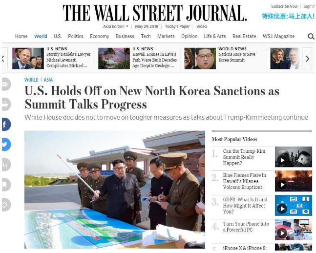 据美国《华尔街日报》5月28日报道称,美国决定推迟对朝鲜实施新一轮重大制裁措施,同时希望重启特朗普和朝鲜领导人金正恩下月举行的峰会。