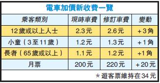 【香港商報網訊】記者周偉立報道:行政長官會同行政會議昨日通過港島區電車加價,成人每程加3角至2.6元,小童及長者加1角至1.3元及1.2元,遊客票維持在34元,新收費將於今年7月2日生效。
