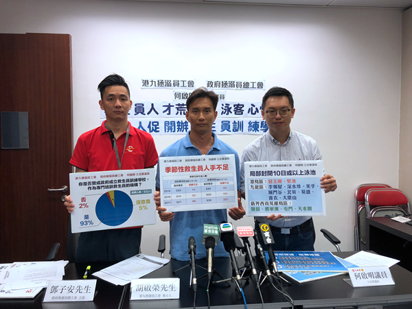 兩個救生員工會:港九拯溺員工會及香港政府拯溺員總工會聯同立法會議員何啟明昨日召開記者會講述業內苦況。工會指出,踏入6月,本港進入泳季的高峰期,然而,康文署轄下的公眾泳池不是因需要維修保養而局部封閉,就是救生員數目不足,難以應付高需求的泳客流量,此舉影響服務質素,更嚴重影響泳客、公眾的安全。