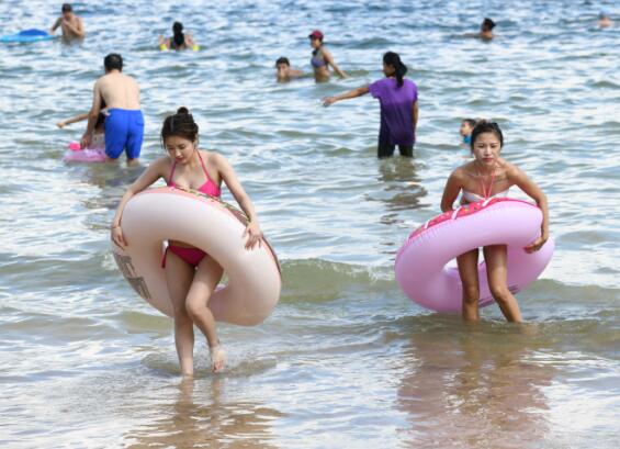 酷熱天氣連續14天,不少市民選擇到海灘嬉水消暑。記者崔俊良攝