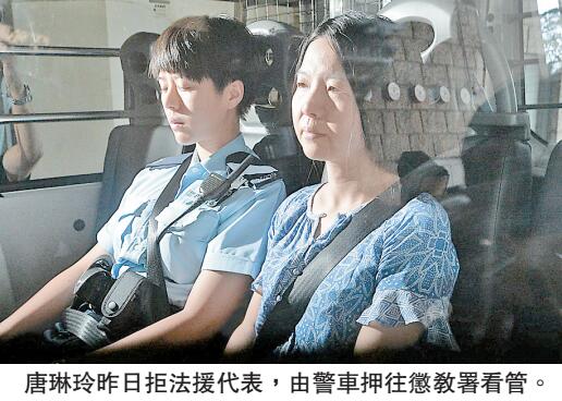 唐又問陳官為何將她還柙,陳官解釋,她被指控在庭內拍照,如指控成立即等於藐視法庭。唐回應稱,她有申請保釋,惟有人盜用她的現金。陳官質疑她所有錢被偷去,唐澄清「不是偷光,是偷竊」。陳官再追問唐向法庭提供的地址并不存在,唐笑稱這并無違法,可能她對於香港地址格式不清楚。