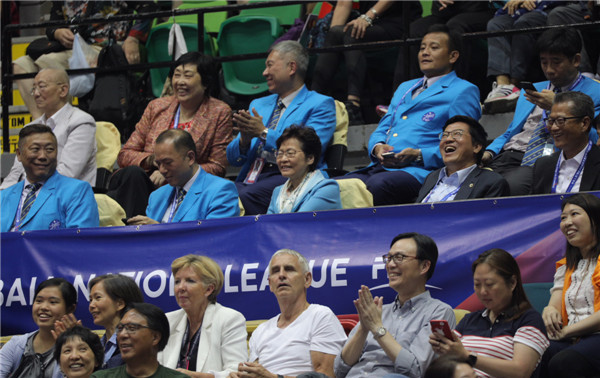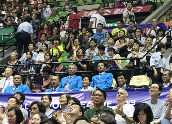 世界女排聯賽香港站昨晚上演重頭戲,中國女排於紅館出戰日本隊,行政長官林鄭月娥(第二排中)忙里偷闲,暫時拋開繁忙公務,親自到紅館為中國女排打氣,同來捧場的還有財政司司長陳茂波(第二排右)。比賽最終結果,中國女排以局數3比0贏日本隊。