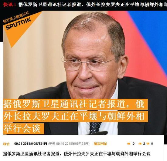 据俄罗斯卫星网5月31日报道,俄外长拉夫罗夫正在平壤与朝鲜外相会谈。