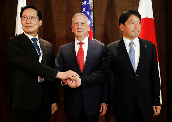 美國防長馬蒂斯、韓國防長宋永武、日本防衛大臣小野寺五典,都對韓朝達成《板門店宣言》等韓朝首腦近期兩次會晤的成果,以及朝鮮近期停止核導彈試驗和廢除核試場等舉措表示歡迎,認為這些積極變化為朝美首腦會談創造了條件。三方商定繼續加強安全合作,支持推動半島實現完全、可驗證、不可逆轉無核化目標的各種外交努力,決定繼續履行聯合國安理會決議。三國防長在新聞稿中表示,朝鮮若能完全遵守國際義務,朝鮮居民的安全與繁榮將有大幅增進。