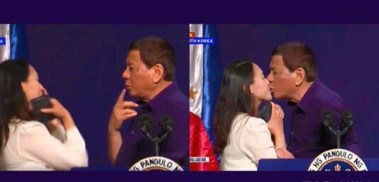 图为杜特尔特亲吻女侨民的截图。