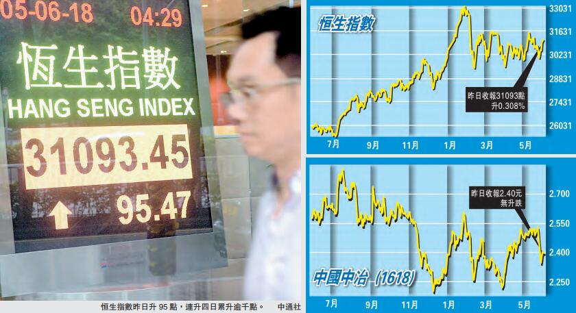 A股入摩為港股帶來動力。其中MSCI全球標準指數內的中國指數,新加入302隻股份,變動在上周四已生效。MSCI中國指數新納入的H股包括中國中冶(1618)。中國中冶今年第一季度報告,按中國會計準則,實現營業收入551.97億元(人民幣,下同),按年增加24.9%;錄得純利16.61億元,增長15.2%,每股收益8分。公司今年首季新簽合同額1729億元,較上年同期增長37%,其中新簽海外合同額為50.3億元。去年中國中冶業績已見穩升,2017年實現營業收入為2440億元,按年增長11.1%;錄得純利60.61億元,增長12.8%,每股收益26分,每10股派息0.68元。該公司全年新簽合同額6049.01億元,增加20.4%。中國中冶2018年預測市盈率只約5.6倍,息率為3.42厘,估值非常合理,可趁上周下調仍待收復,在反彈途中作吸納。