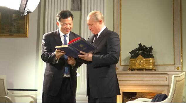 △在采访前,慎海雄向普京总统展示了中央广播电视总台旗下新媒体平台推出的网络互动活动“谁是普京粉”和“我想问普京”的画册。画册封面印有习近平主席与普京总统的合影。
