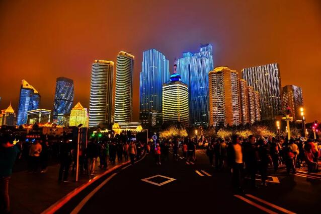 △中国山东青岛夜景。随着上合组织青岛峰会的临近,沿海一带热门景点的立面灯光秀绚丽夺目。