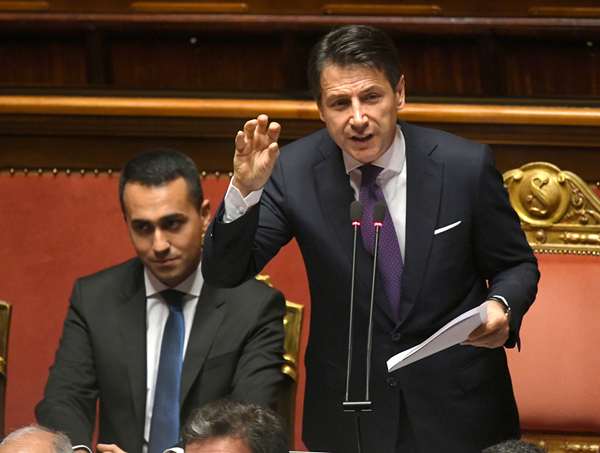 意大利總理孔特(右)在參院發表施政演講。 新華社