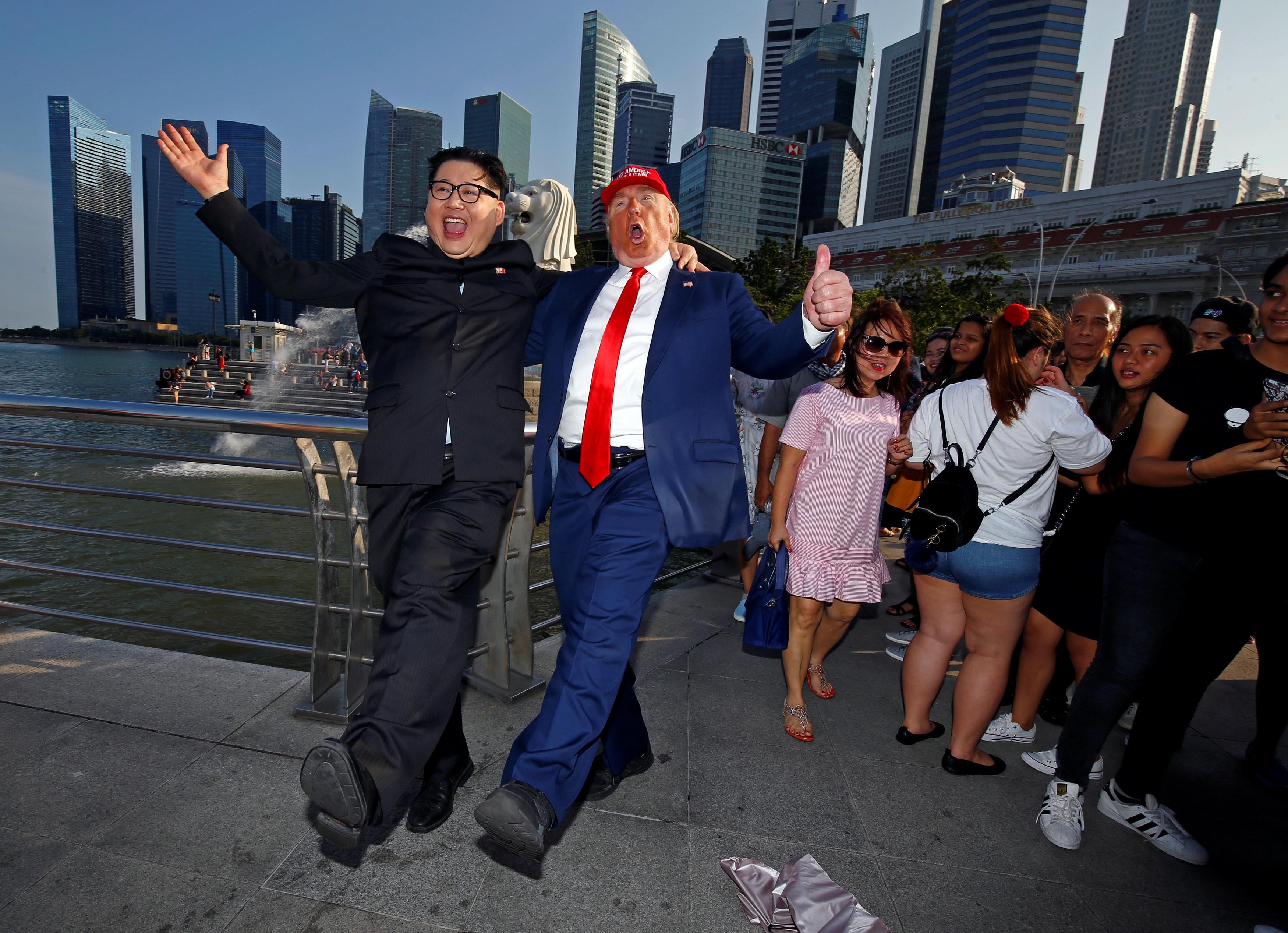 特朗普与金正恩本人尚未抵达新加坡,但A货版的「特金」已提前到达当地,吸引了不少游人注目。路透社