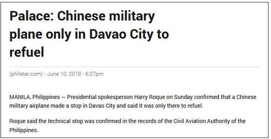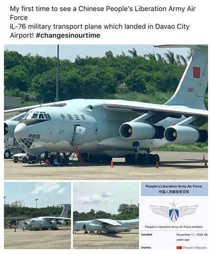 “中国军机出现在达沃机场”的消息8日出现在菲社交网站上,引来大量转发和猜测。《菲律宾星报》称,一张照片显示,中国空军的一架伊尔-76运输机8日出现在达沃国际机场,在杜特尔特多次表述不愿和中国开战的背景下,中国军机出现在杜特尔特的老家,引起“恐慌”。10日,克里斯托弗·吴发表声明称,菲政府相关部门提前接到并批准了中国空军伊尔-76运输机在菲停靠加油的申请,外国政府和商业飞机的此类技术性停靠符合相关规定,“需要时,菲政府飞机也被准许在国外进行技术性停靠”。