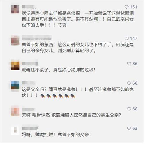 嫌犯为被害人父亲的事实让网友们很愤怒。看到警方将两姐妹的尸体从山上抬下来,不少围观村民都禁不住哭了,并痛斥其父亲的残忍。