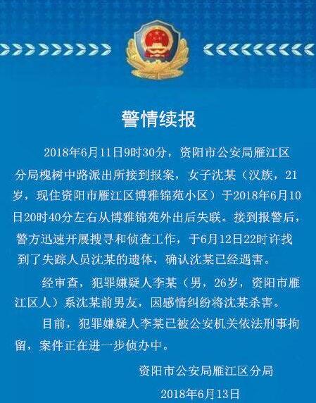 13日凌晨1时许,资阳市公安局雁江区分局通报称,接到报警后,警方迅速开展搜寻和侦查工作,6月12日晚上10时许,找到了沈思慧的遗体,确认其已经遇害。