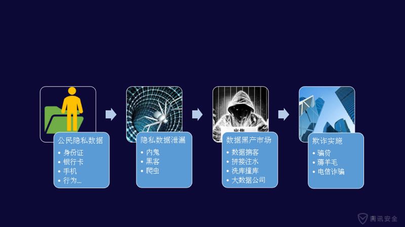 巨大的利益滋生了围绕金融行业的新的黑色产业链。不法分子互联网化、科技化的运作,他们对于病毒木马、恶意工具、大数据、AI的应用,可能比金融行业很多从业人员起得更早。黑产在大数据方面已经形成一套分布式的数据窃取、处理、交易和传播的产业链条,大量公民隐私数据在网络上传播。