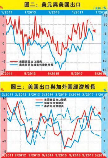 上述三圖預示結果一致,就是美國出口增長在未來兩季將見明顯放緩。相信無論特朗普短期內能否解決與各國的貿易糾紛,短線也扭轉不了美國出口增長轉弱的趨勢。與其花更多時間與其他貿易夥伴發生摩擦,倒不如從匯價入手,或與加拿大建立友好關係及助長其經濟增長,應較直接改善美國出口情況。